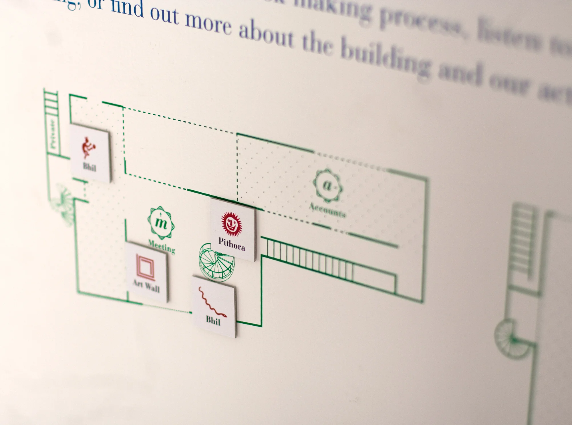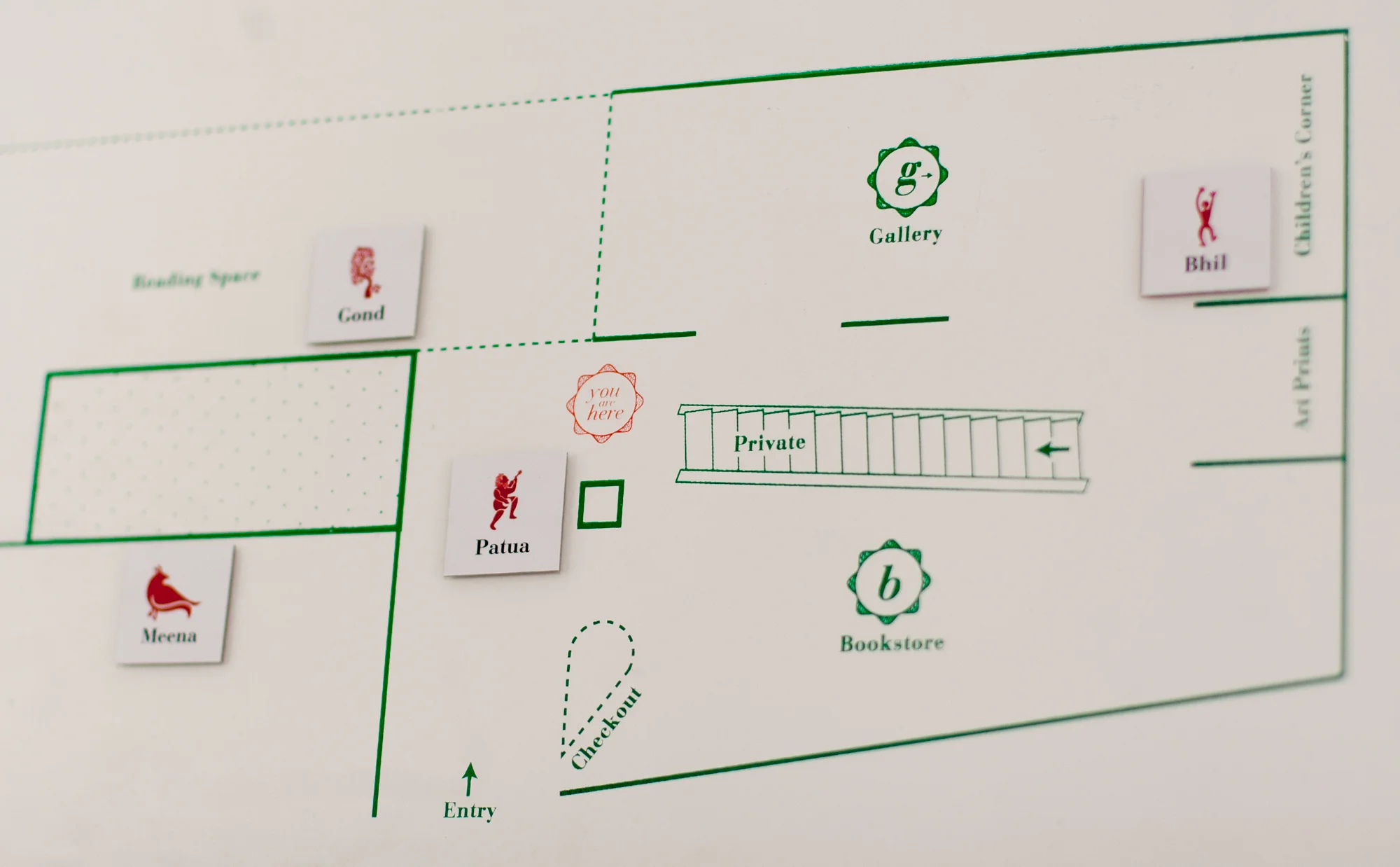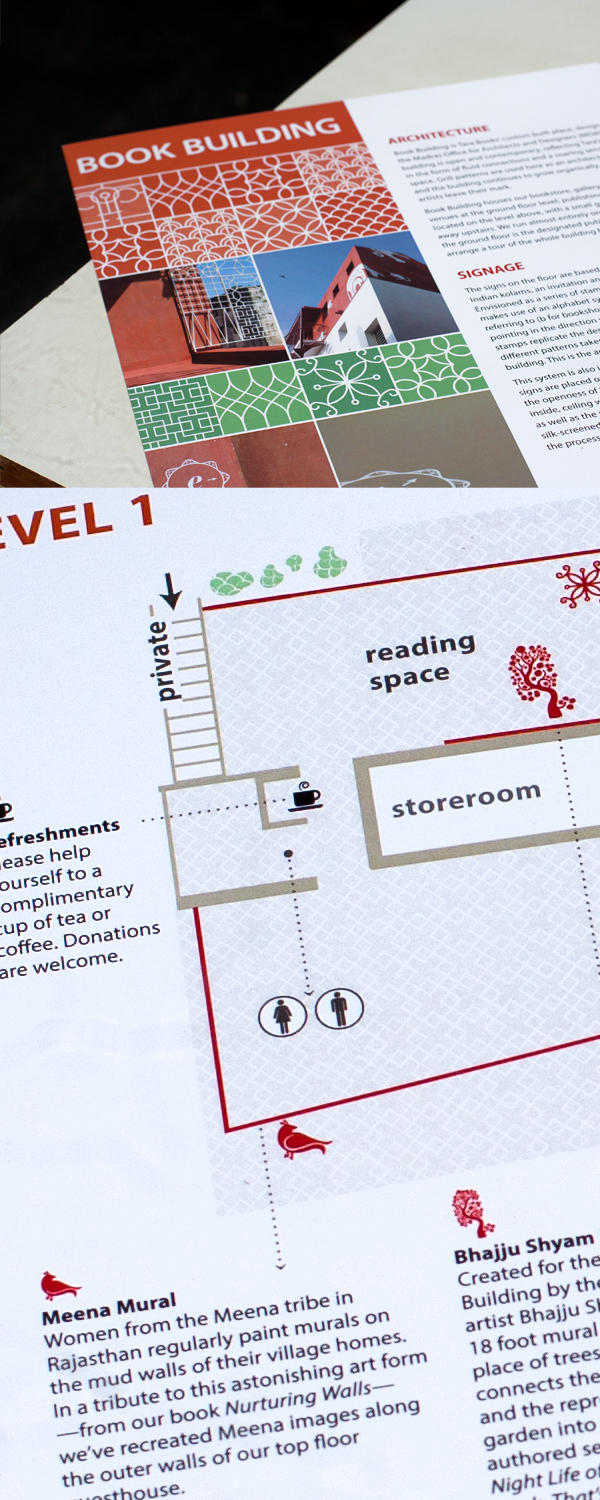 Map designed to guide first-time visitors to Tara Books' Book Building in Chennai. The map includes specially designed icons to mark out the many custom murals by traditional artists that can be found throughout the building.